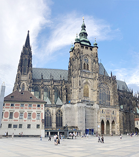 聖維特大教堂經歷了585年的修建,期間多次遭遇建築師病故、宗教衝突(如胡斯戰爭和三十年戰爭)及火災,最終在20世紀完成這座名聞遐邇的大教堂。教堂融合了哥德式和文藝復興風格,外觀壯觀,尖塔高聳入雲。