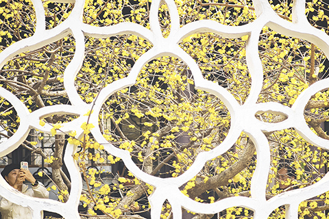 ◎ 一月十八日,南京古典園林瞻園內,綻放的蠟梅映襯白牆黛瓦盡顯雅致,吸引民眾前來品味「梅」好時光。(中新社記者 泱波 攝)