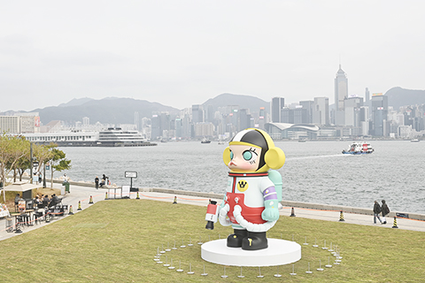 ◎ 一月二十日,中國內地潮流玩具公司泡泡瑪特旗下知名IP「Molly」的巨型裝置亮相香港西九文化區。該巨型裝置是「『Molly』二十周年特展」的展品之一,特展將於一月二十四日正式舉行。據悉,「Molly」由香港設計師王信明在二零零六年創作,並於二零一六年授權泡泡瑪特商業使用。圖為巨型「Molly」裝置與香港維港景色。(中新社記者李志華 攝)