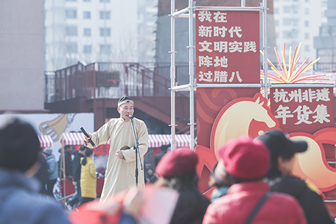 ◎ 一月廿四日,演員在杭州非遺年貨集活動現場進行杭州特色的「小熱昏」方言表演。