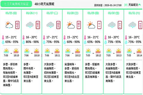 【特訊】地球物理氣象局消息:預料未來兩三日受偏東氣流影響,氣溫回升,雲量增多及有幾陣雨。展望本周中期天色稍為好轉,日間短暫時間有陽光,本周後期雲量再次增多,有幾陣微雨。
