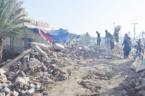 ◎ 巴基斯坦警方一月二十三日說,該國西北部開伯爾-普什圖省當晚發生一起自殺式爆炸襲擊,造成至少五人死亡、十人受傷。圖為二十四日,在巴基斯坦西北部開伯爾-普什圖省德拉伊斯梅爾汗地區,人們檢查爆炸現場。(新華社發)