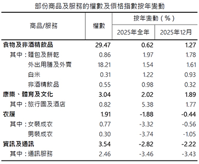 2025年食物及非酒精飲品(+0.62%)大類價格指數按年上升,主要是外出用膳及外賣收費、麵包及餅乾,以及白米價格上調所帶動,而鮮魚和豬肉的價格則下跌;住屋及燃料(+0.25%)大類亦因住屋租金調升而錄得升幅,而電力價格下調則緩減了上升的幅度。各大類指數中,康樂、體育及文化(+2.02%)和雜項商品及服務(包括個人護理、保險,以及首飾和鐘錶等,+1.85%)錄得較明顯按年升幅。另一方面,資訊及通訊(-2.82%)、衣履(-1.88%)和運輸(-1.15%)大類的價格指數則下跌。全年甲類及乙類消費物價平均指數按年分別上升0.28%及0.37%。