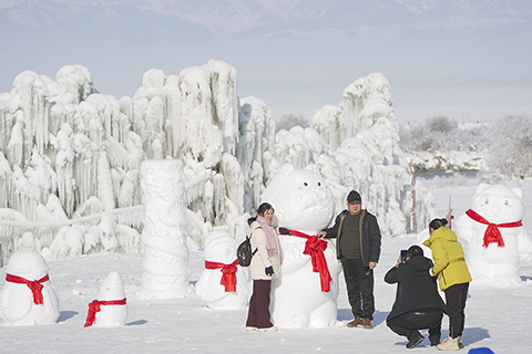 ◎ 一月三日,遊客在新疆昭蘇縣冰雪樂園參觀冰雕作品。(新華社記者 胡虎虎 攝)