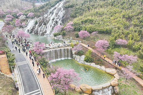 ◎ 一月二十五日,航拍貴安新區「貴州梅園」吸引遊人。近日,位於貴州貴安新區的「貴州梅園」內五萬餘株寒梅競相綻放,吸引遊客和市民前來觀賞、拍照。(無人機照片)(中新社記者 瞿宏倫 攝)