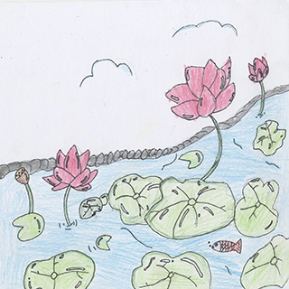 沙沙地吹過葉子,幾滴露水掉了下來,落到了我的鼻尖上,清涼的感覺令人神清氣爽。忽然,小徑上悄悄下起了毛毛雨,我趕快跑到小亭子裏。周圍的景色彷彿蓋上了一層灰濛濛的布,四處的顏色暗淡了許多。青蛙像一位身披綠色袍子的小精靈,在一片灰色中格外顯眼。