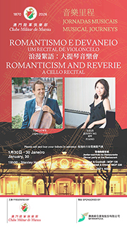 切實擔負起治理澳門第一責任人的責任 岑浩輝:堅持及完善行政主導 澳門成首個兩度舉辦城市 奪「二0二七年中國會展經濟國際合作論壇」主辦權 山西省與澳合辦「晉享年俗 趣玩山西」推介會 推進跨境旅遊全方位合作 將加強跨境票務消費維權協作營造安全灣區文體消費環境 粵澳消委會聯合發佈跨境消費提示 司警破一宗不法借貸收留案 拘三名高利貸及救出債仔 司警破一宗不法匯兌詐騙一百萬港元案拘兩男 涉訛稱收不到轉賬拒付款圖遁逃 《澳門特區公報》內容簡介 大提琴音樂會本周五舉行 文學營格律工作坊報名 印度西孟加拉邦現可致命的尼帕病毒 衛生局籲居民外遊注意防範 澳代表團赴京出席中華醫學期刊集群研討會 《澳門醫學雜誌》納中華醫學期刊集群 將進一步提升服務質量和效率 澳大學生會新領導層就職 勞工局去年共揭發六六八人次涉非法工作並作出處罰 昨揭兩過職司機必予嚴懲 「記憶沙龍」校園專場報名 二零二六珠港澳「安心在珠.百事通達」 醫療醫保服務交流會在珠舉行 譚偉文:堅持和完善行政主導 以實效回應巿民期待 環保局生態活動報名 房局推電子支付服務 方便社屋及公屋商鋪租戶交租 遺體待領 陳子勁:堅守行政主導 築牢安全防線 化地瑪聖母女子學校學生胃腸炎個案 市政署與衛生局正調查 夏寶龍對港澳新一屆立法會議員提出 厚植家國情懷等五點要求 宋敏莉:堅守行政主導 促進澳門特區良政善治 十月初五坊會新一屆理監事宣誓就職 進一步凝聚坊眾共建和諧社區 柯嵐:堅持完善行政主導 推動各項工作創新發展 黃少澤:積極主動作為 維護好落實好行政主導 張永春:堅定貫徹行政主導原則 鞏固行政立法良性互動 戴建業:貫徹行政主導 聚力多元發展 增強經濟韌性 大提琴音樂會本周五舉行 2026-01-27 03:30:00 【特訊】澳門陸軍俱樂部活動「音樂里程」將於本月三十日(星期五)下午七時在何鴻燊博士廳舉行。 音樂會主題為「浪漫絮語:大提琴音樂會」,演出者為Tim Lowe(大提琴)及伍凱鈴(鋼琴)。 音樂會的觀眾上限為六十人。 音樂會結束後,賓客可參加為此音樂會特設的晚宴,訂座上限為五十人。 訂座或購票詳情,可致電二八七一四000。◇