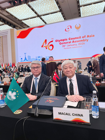 【特訊】亞奧理事會(OCA)於2026年1月26日在烏茲別克 - 塔干舉行了「第四十六次會員大會」。中國澳門體育暨奧林匹克委員會主席陳澤武及副主席潘永權代表出席大會。