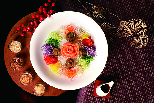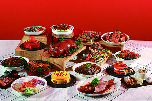 節慶菜單以寓意吉祥的新春撈起三文魚為亮點,融合三文魚、金黃薄脆和蔬菜絲,可親手「撈起」為新年掀起好運。菜單包括新加坡黑胡椒蟹、發財蠔豉大利及新春鴻運當頭烤乳豬。為增添歐陸風味體驗,餐廳特別設有廚師即席主理的現切伊比利亞5J火腿,甜品專區品嚐主題甜點,為這頓豐盛團圓聚餐畫上圓滿句號。