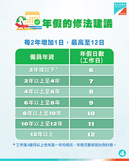 諮詢文本建議:在現時工作滿1年可獲6個工作日年假基礎上,每滿2年年資者年假日數增加1個工作日,最高年假為12個工作日。