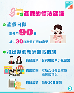 根據上述調研,諮詢文本中建議將現行70日產假調升至90日,其中30日產假可提前享受。政府就本地女性僱員享受產假向合資格的中小企業提供最多20日(工薪)補貼。