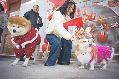 天津舉辦寵物年貨節 2026-02-02 03:30:00 ◎ 二月一日,天津舉辦寵物年貨節吸引眾多市民攜愛寵參與。活動現場設置寵物年夜飯試吃、新年打卡拍照、免費領取寵物圍巾等環節,匯集了京津冀多家寵物文創品牌,涵蓋零食、新春服裝、玩具、飾品等全品類寵物用品。圖為市民與兩隻身穿新春服裝的寵物互動。(中新社記者 佟郁 攝)