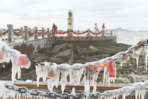 山東煙台:月亮灣裹「冰衣」 2026-02-07 03:30:00 ◎ 二月六日,山東煙台月亮灣景區,受低溫與海風共同影響,月亮老人雕塑、臨海護欄凝上冰層,海岸被冰妝點,別有一番冬日景致。(中新社記者王嬌妮 攝)