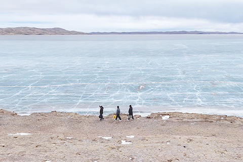 ◎ 青海瑪多,氣象局工作人員行走在鄂陵湖畔。瑪多縣地處黃河源頭,平均海拔四千五百米,是中國三江源國家公園黃河源園區的核心地區。每年春節前夕,氣象局工作人員都會開展設備巡檢維護工作,為黃河源頭生態保護、災害預警和牧民安全提供重要保障。(無人機照片)(中新社記者馬銘言 攝)