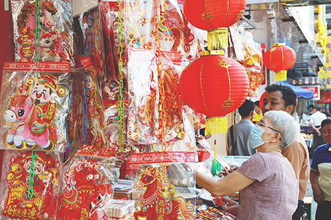 ◎ 二月十一日,顧客在緬甸仰光唐人街選購春節飾品。(新華社發 苗覺梭 攝)