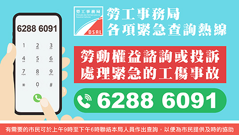 又:為協助市民處理緊急的勞動權益事務或工傷事故,勞工事務局將於本月十六日下午至十九日,每天上午九時至傍晚六時設立假日緊急熱線六二爸爸六0九一,確保僱員及僱主在有需要時能及時獲得適當的協助與指引。◇