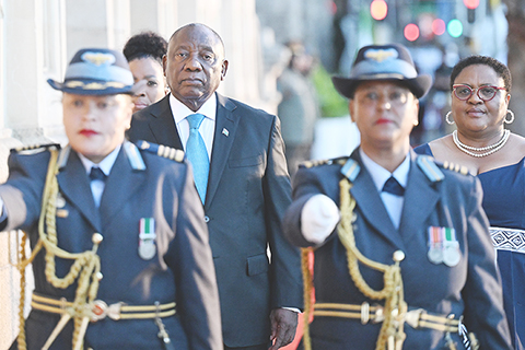 ◎ 南非總統拉馬福薩二月十二日表示,南非政府今年的首要任務是加大力度打擊有組織犯罪、幫派暴力和非法採礦,將部署軍隊支援警方開展相關行動。圖為當日,在南非開普敦,南非總統拉馬福薩(中)抵達開普敦市政廳。(新華社發 哈比索.姆卡貝拉 攝)