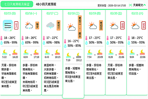 2026新春花車匯演將於年初三及年十二 分在西灣湖及北區上演 海事博物館 逢周六、日增設導賞 澳門婦女發展第二個目標 特區政府正開展文本擬訂工作 昨日各口岸共有逾十四萬旅客人次入境 新春市集令福隆區人流增 教青局與海關在關閘口岸一帶 聯合開展社區宣教工作 工務局辦建築業界說明會加強聯繫 將持續優化私人工程審批 冀政府與社團於缺口落實機制並加強鄰里關懷 群力促補強弱勢節日支援 讓院生訂立新年目標激勵努力奮發 少年感化院舉行立志儀式 對望德堂區旅遊配套 水荷雀坊會冀予優化 與懲教局探討更生輔導合作事宜 婦聯歲晚訪女在囚人傳關懷 澳門外勞仲介協會建議政府資助社團遊活動 冀讓東南亞外僱同歡渡春節 多方舉措迎客度歲 澳門旅遊局積極部署 花店生意增三成 餐廳早告訂滿 珠寶店受歡迎 情人節市道暢旺節日氣氛濃 公建局促工地做好新春安保 青年義工宣傳食安迎新春 治安警與司警進行「冬防行動二零二六」 共截查二百九十五人 主線全長約五公里 雙向六車道 珠海隧道通車緩解珠東西部交通壓力 梁氏宗親聯誼暨賀宗祠重光 關前街舉行新春寫揮春活動 書法家為市民遊客寫揮春 協和「健康講座」報名 廣東電網將打造 對港對澳供電智慧可靠示範標桿 雷綺雯:支持增產假天數 冀研究延長男士侍產假 街總呼籲做好「冬防」部署平安度歲 警籲須防假冒大西洋銀行釣魚短訊 以免個人及信用卡資料被盜用 未來數日早晚天氣潮濕 今日天晴早晚有霧 報稱遭一女子藉裸聊多次勒索 一內地青被騙近五萬元 為提升從業員的防罪意識及應對能力 司警與澳娛辦防罪工作坊 未來數日早晚天氣潮濕 今日天晴早晚有霧 2026-02-15 03:30:00 【特訊】地球物理氣象局消息:受偏東氣流影響,預料未來數日早晚天氣潮濕,有薄霧或霧,日間溫暖。展望一股東北季風將於年初一抵達華南沿岸,屆時氣溫略降及雲量增多;隨後春節假期早晚天氣清涼,天色逐漸好轉。 預測今日天晴,部份時間多雲。早晚有薄霧或霧。吹二至三級東至東南風。氣溫約為攝氏十八至廿六度。相對濕度介乎百分之六十五至九十九之間。預測最高紫外線指數約為八,級別屬於甚高。◇