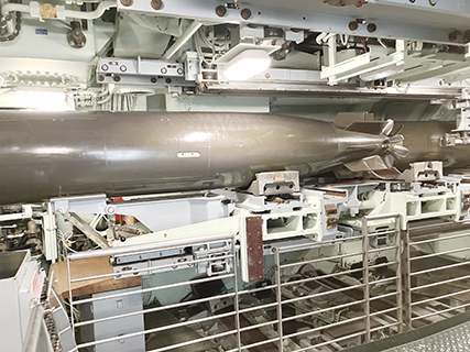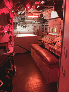 從艇頭進入,先是佈滿儀表,按鈕,綫路管導,及燈號的中央控制室,繼而沿着僅容一個人的曲折通道,依次參觀了電訊室,電報室,工具擺放室,魚雷彈藥儲存庫。所有空間極為擠逼,位盡其用。