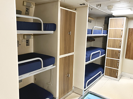 艇內設有官兵寢室,是一格格的三層短窄卧鋪,還有廚房,用膳飯堂。最令人眼前一亮的,是艇長會客室,兩張淡黃色真皮梳化,配小桌子和精緻壁櫥,豪華舒適;艇內戰略裝備和生活設施應有盡有,麻雀極小,五臟俱全。