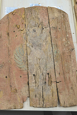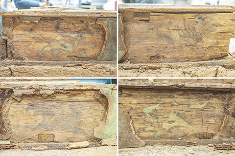 ◎ 這是在實驗室考古方艙內拍攝的墓葬M20出土的木棺座壼門內的彩繪「瑞獸」圖案(二月一日攝)。(新華社記者李賀 攝)