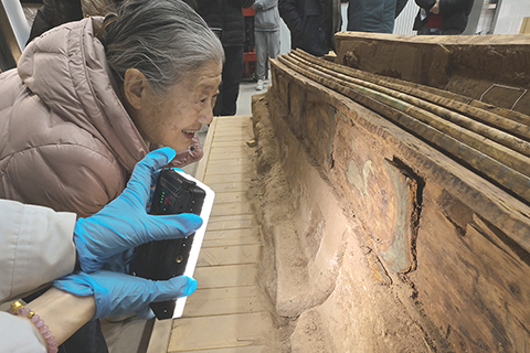 ◎ 專家們在實驗室考古方艙內察看墓葬M20出土的帶有彩繪和文字的木屏風(二月一日攝)。(新華社記者李賀 攝)