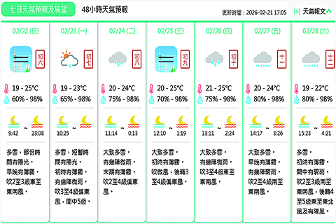大三巴街一連五天實施人潮管制 行人專用區成效理想 婦聯建議有序擴大禁煙範圍 婦聯倡活化路環文旅配套 澳門大學與香港理工大學 成立機器人與具身智能聯合實驗室 農曆新年行人專用區 今日為最後一天設置 《爺爺奶奶一堂課》五周年 展覽暨義賣展下月一日揭幕 二0二六無人機煙花匯演 第二場將於年初七上演 管院與山東商業職業技術學院 共同培育高質量人才 打卡聽歷史 童聲傳薪火 珠高新區紅色文旅活動成新春風尚 爆竹、煙花燃放活動結束 整體人流較往年遜色 為有利於應對和清理海上垃圾 海事局持續尋求優化措施 治安警在年廿八至年初四 共檢控三宗的士違規 澳葡女性藝術工作坊促交流 葡西兩國水災致十五人亡 明愛籲各界捐助 一澳女墮釣魚短訊騙局損失四千八百元 一澳婦遭網上情人騙去逾十萬人幣 群力倡優化輕軌規劃建設 以民為本構建智慧交通網絡 燃料安全排查及宣教工作 消防局持續開展 出入境巴士及的士服務 胡景光認須予優化 工聯松柏之家迎新年 舉辦中醫健康及防火講座 去年下半年新批核中小企信貸 較上半年下跌百分八點四 新一期《澳門醫學雜誌》已出版 下一期三月二日截稿 首屆「中華文化演出季」跨年度舉行 中國煤礦文工團為澳帶來四場表演 青洲坊元宵特色市集周五開幕 打造節日新體驗 修改《勞動關係法》調升產假及年假日數 首三場諮詢會與會者提多項建議 關愛會發佈《青少年不健康飲食調查研究》 提出立法規範校園食品銷售等 「我家圖書館」新增支付工具 澳門電訊稱在二0二七或二0二八年 預計可參與6G測試 今日多雲早晚有霧 苦難善耶穌聖像巡遊 大堂區一帶道路今有限度通車 今日多雲早晚有霧 2026-02-22 03:30:00 【特訊】地球物理氣象局消息:預料本周初至中期受偏東氣流影響,雲量逐漸增多及有幾陣微雨,早晚能見度較低。展望本周末期受低壓槽影響,驟雨增多。 預測今日多雲,部份時間有陽光。早晚有薄霧。吹二至三級東至東南風。氣溫約為攝氏十九至廿五度。相對濕度介乎百分之六十至九十八之間。預測最高紫外線指數約為七,級別屬於高。◇