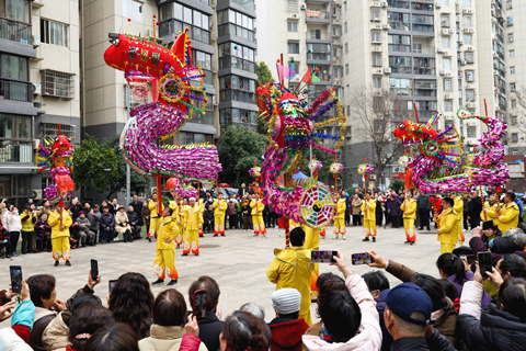 ◎ 二月二十七日,湖北武漢,漢陽高龍走進社區進行表演。漢陽高龍源於唐代貞觀年間,至今已有一千四百多年的歷史。漢陽高龍採用竪式舞法,與其他各種龍燈均不相同。圖為高龍表演吸引民眾觀看。(中新社記者張暢 攝)