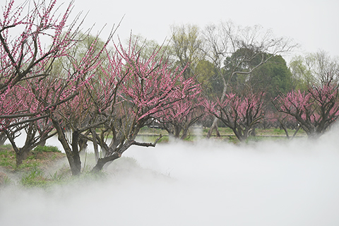 ◎ 三月五日,水霧中的梅花林。近日,浙江杭州西溪濕地梅花盛開,引諸多遊人「曲水尋梅」。(中新社記者 劉子琳 攝)