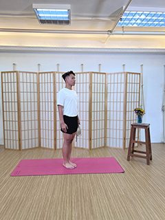 先從站立的山式開始。雙腳合攏,把身體重量平均分佈在雙腳的腳掌上,挺胸並保持脊柱向上伸展,同步加強脊柱彈性。先把伸展帶放在右側,將右腳提起,屈曲膝蓋,並同時替右腳套上毛巾或伸展帶,提起胸腔,目視前方,進入準備單腳平衡的體式。[圖一]