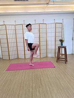 繼而最後一次提起右腿,同樣地要比上一次提更高,注意確保左腿能以單腳站穩,保持動作二十秒,之後換腳。換腳後,將伸展帶套在腳底,保持平衡或者向上提起單腿。[圖四]◇