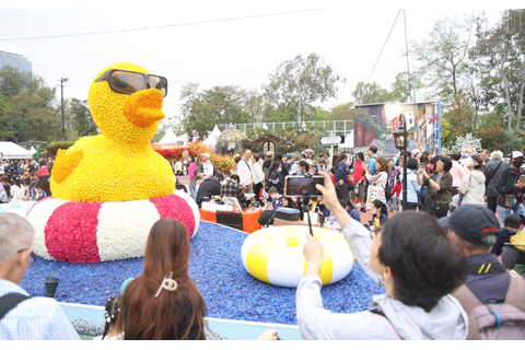 ◎ 三月二十日,香港花卉展在維多利亞公園開幕,以「花語尋「香」--細味城市特色」為主題,展出約四十萬株花卉,包括約四萬株主題花紫羅蘭。活動由即日起至三月廿九日,今年大會的大型園林造景以香港本土特色為主題,設置多個地標裝置如中環摩天輪、金魚街、搶包山等,將香港各區特色景點和城市風貌呈現出來,吸引眾多市民遊客參觀打卡。圖為小黃鴨園圃。(香港中通社記者 鄧梓傑 攝)