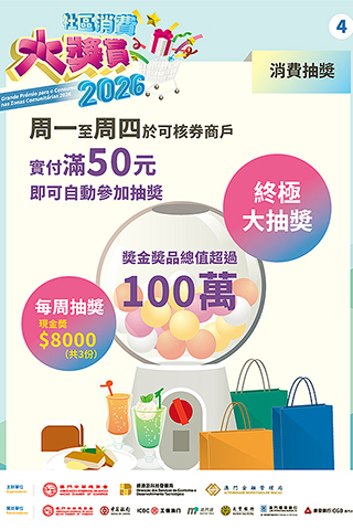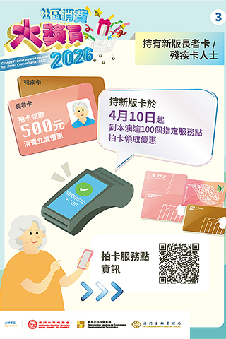 活動將於4月10日正式啟動,經科局冀在商會、社團和居民的積極配合和參與下,為本澳消費市場注入活力,盤活社區經濟,推動經濟適度多元發展。市民如欲了解更多活動詳情,可瀏覽「2026社區消費大獎賞」活動專頁(https://www.macaospendingrewards.com/)或致電熱線電話(28575472或28575439)查詢。◇