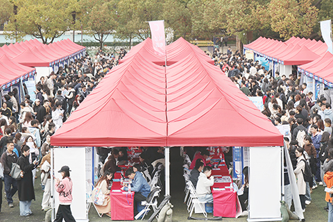 平陸運河全線橋樑工程即將收官 上海舉行大型招聘會促高校畢業生就業 高雄·北京特色周 粵港澳大灣區城市供水十年來 首次未受鹹潮明顯影響 台灣西部降雨創七十五年來最低 衝擊半導體產業用水 《瞭望》刊發文章 智能科學家來了 上海舉行大型招聘會促高校畢業生就業 2026-04-01 03:30:00 ◎ 三月卅一日拍攝的招聘會現場。當日,二零二六上海高校畢業生「春季促就業攻堅行動」暨就業實習招聘會在上海師範大學徐匯校區舉行。本次招聘會吸引八百餘家用人單位參加,涵蓋集成電路、生物醫藥、人工智能、金融服務、教育行業、信息技術等領域。(新華社記者劉穎 攝)