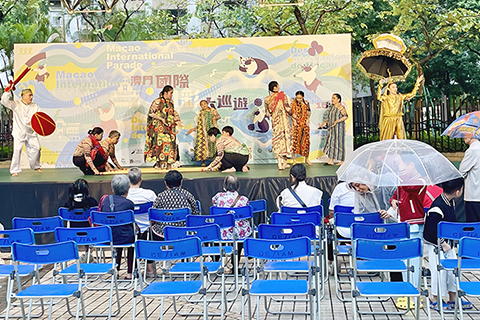 澳門國際幻彩大巡遊延伸演出昨日下午分別在綠楊花園休憩區和祐漢公園舉行,團體帶來印度及菲律賓歌舞、瑜伽表演等,展現當地傳統文化風采。期間雖然天氣不穩,時有陣雨,但無阻表演者熱情歌舞,街坊亦相當捧場,冒雨撐傘支持,以掌聲和拍照予以最熱烈的回應。◇