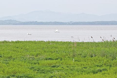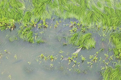◎ 四月九日,江西鄱陽湖都昌水域,鷺鳥或棲息在草洲,或飛翔于湖面。連日來,中國最大淡水湖鄱陽湖水位上漲,連片濕地草洲茂密葱鬱。湖區良好的自然環境,為候鳥和魚類提供了適宜的棲息繁殖空間。(無人機照片)(中新社記者 劉佔昆 攝)