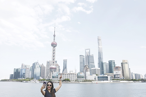◎ 四月九日,遊客穿著夏裝在外灘濱江步道上拍攝視頻。當日,上海中心氣象台測得全市最高氣溫逼近攝氏三十度。(中新社記者 殷立勤 攝)