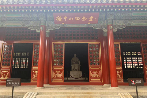 緊鄰衣冠冢的第一座大殿則是孫中山紀念堂,紅匾金字,匾額為宋慶齡手書。殿堂正中安放著一尊高二點九米的孫中山全身塑像,由三塊漢白玉雕刻而成,盡顯先生颯爽英姿。