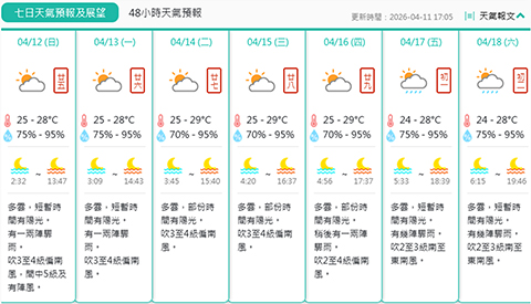今日多雲間有陽 2026-04-12 03:30:00 【特訊】地球物理氣象局消息:預料未來數日持續受偏南氣流影響,天色以多雲為主,日間較為炎熱,有一兩陣驟雨。展望本周後期轉受華南的低壓槽影響,驟雨增多。 預測今日多雲,短暫時間有陽光。有一兩陣驟雨。吹三至四級偏南風,間中五級及有陣風。氣溫約為攝氏廿五至廿八度。相對濕度介乎百分之七十五至九十五之間。預測最高紫外線指數約為六,級別屬於高。◇