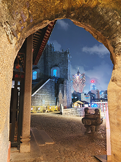 讓圖片說話,框內有三百多年歷史的聖保祿教堂(大三巴牌坊)正門遺址背部,墩厚雄偉,當年雄風仍有跡可尋,位於其右側的哪咤古廟始創於1888年,這座小廟內裡供奉托塔天王李靖的第三子哪咤,廟前牌扁題字「保民是賴」,反映了有保佑黎民之力,每年都有辦哪咤三太子巡遊活動慶典,整體風格內歛樸素,平實親民,遠處有現代化的建築物,型似盛放蓮花的澳門新葡京頂部及緃觀如火箭的中國銀行(澳門)總行的頂層,一框巧妙地將四百年連繫在一起,讓歷史與時代對話。