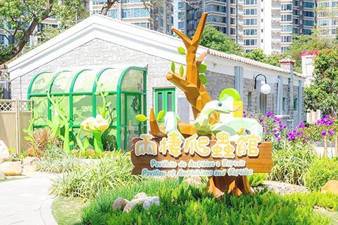 兩棲爬蟲館共六個主題展室,包括「兩棲爬蟲的奇妙世界」「澳門原生精靈」「棲息環境」「叢林精靈」「兩爬與水」「反思與保護」。是以兩棲類及爬蟲類為主題的教育場所,展出26個兩棲類及爬蟲類物種。除展出澳門本地原生兩棲爬蟲物種外,亦展出了部份受市政署動物醫療及生態保育團隊救治及照顧的動物,還有因非法貿易而被扣押或被人類遺棄的寵物等;當中包括黑澤巨蜥、緬甸蟒、密西西比地圖龜、墨西哥刺尾鬣蜥、及巨人守宮、白蛇、玉米蛇等。