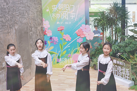 ◎ 四月十七日,北京朝陽門街道二零二六年「春日賞書季」在雪蓮.亮點文創園拉開帷幕。本屆「春日賞書季」活動為期一個月,整合多元文化空間,推出書香漫遊、人文沙龍、藝術展演等活動,深化閱讀友好街區建設,點亮書香生活。圖為小學生們在啟動儀式上表演詩朗誦。(中新社記者賈天勇 攝)
