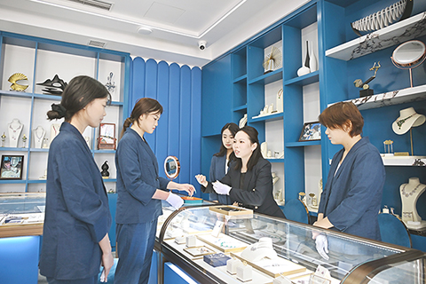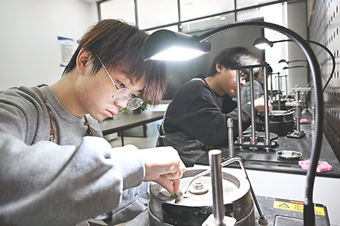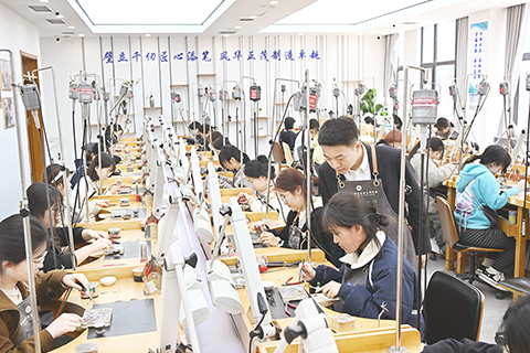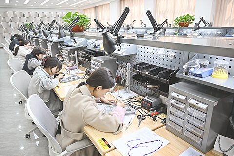 近年來,山東青島幼兒師範高等專科學校珠寶學院依託校內實訓基地和生產性實訓平台,將珠寶行業全流程實操場景搬進課堂。學生在這裡不僅能學習珠寶專業理論,練習寶玉石鑒定、加工、琢磨等傳統技藝,還能學習AIGC首飾設計、3D建模、數碼影像、直播帶貨等數字化技能,參與企業真實訂單生產、產品質監檢測等實戰環節,掌握當下珠寶行業所需的複合型技能。(新華社記者李紫恆 攝)