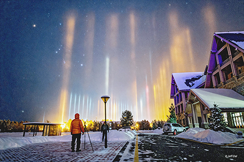 那條街道盡頭發生了甚麼事?眼前所見的並不是極光,而是光柱,這種光學現象通常更貼近地面。在地球大部份地區,幸運的觀測者可以看到日柱,那是一道看似自太陽向上延伸的光束,由扁平飄動的冰晶反射高層大氣中的陽光而形成。通常情況下,這些冰晶體在到達地面之前就已昇華消失。然而,在極寒溫度下,扁平且飄動的冰晶可能會在近地面形成,有時被稱為晶霧。這些微小的冰晶此時反射的可能不是太陽光,而是地面光源。這張影像不僅記錄了多道光柱,還映入了標誌性的獵戶座,拍攝地位於漠河,它是中國最北端的城市。◇