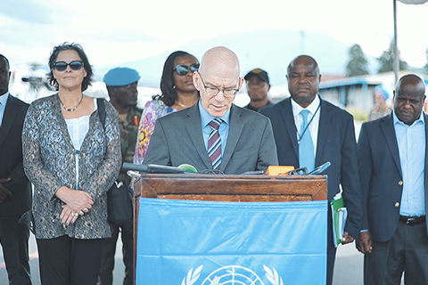 聯合國官員呼籲各方為監督剛果(金)停火創造條件 2026-04-26 03:30:00 ◎ 聯合國剛果(金)穩定特派團(聯剛穩定團)團長詹姆斯.斯旺四月二十四日在剛果(金)東部的北基伍省首府戈馬表示,各方應為剛果(金)停火監督機制有效運行創造必要條件。圖為當日,聯合國剛果(金)穩定特派團(聯剛穩定團)團長詹姆斯.斯旺(前中)抵達剛果(金)北基伍省首府戈馬後對媒體講話。(新華社發)