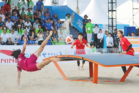 台克球迎來收官之戰。台克球是一項將足球技巧、乒乓球器材“揉”在一起的運動,這是台克球首次登上亞沙會舞台,它也是今年名古屋亞運會的新增項目。