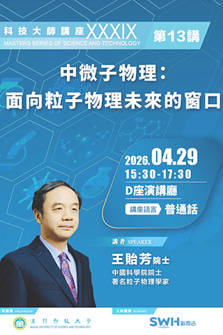 【特訊】由澳門科技大學主辦,新偉浩進出口貿易有限公司支持的本學期第十三場科技大師講座於今(二十九)日下午三時半至五時半在大學D座演講廳舉行,中國科學院院士,著名粒子物理學家王貽芳院士以普通話主講「中微子物理:面向粒子物理未來的窗口」。