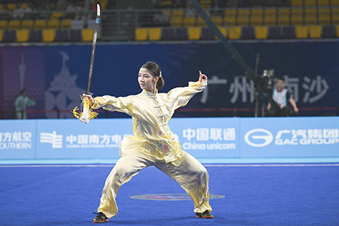 【中新社廣州十一月十日電】(中新社記者 陳建新)第十五屆全國運動會武術套路比賽于七日至十日在廣州南沙體育館上演,賽場雲集各路「武林高手」。作為聯合承辦十五運會的東道主,香港隊、澳門隊選手頗受關注。