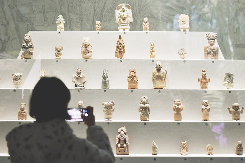 ◎ 十二月四日,河北石家莊,「叢林聖殿──墨西哥瑪雅文明展」展覽現場,民眾參觀出土於瑪雅地區的人形小雕像。該展由河北博物院與墨西哥國家文物局聯合推出,匯聚二百零九件(組)瑪雅古典時期(約公元二五零年─一零零零年)珍貴文物。(中新社記者 翟羽佳 攝)