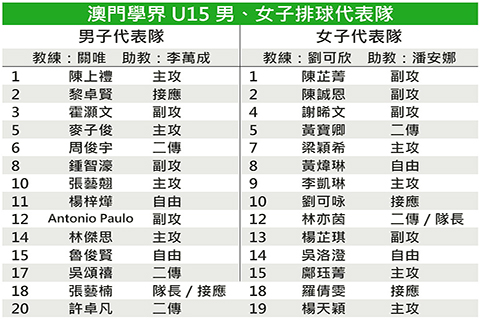 澳門學界U15女排方面,由二傳林亦茵擔起領軍重責,有主攻楊天穎、副攻陳誠恩、接應劉可咏、自由人吳洛澄和另一名二傳黃寶卿等甲組球員坐陣,加上主攻梁穎希、李凱琳、鄺珏菁、副攻陳芷菁、謝晞文、楊芷琪、接應羅倩雯和自由人黃煒琳一同出戰。主教練劉可欣表示,球員經近半年系統訓練,期望球員們能充份展現日常訓練成果,在比賽中全力拚搏,爭取打出場上鬥志及最佳表現,並期望球員們能從比賽磨練中不斷成長。◇